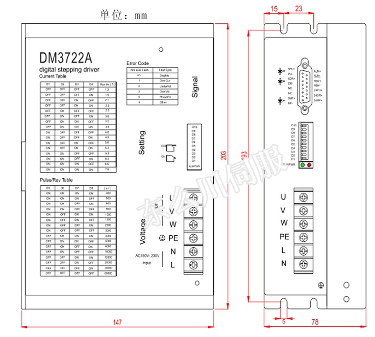 | 2 | Pu- | DP9= OFF, PU為步進脈沖信號 | 下降沿有效,每當脈沖由高變低時電機走一步,要求:低電平0-0.5V,高電平4-27V,脈沖寬度>2.5μS | |